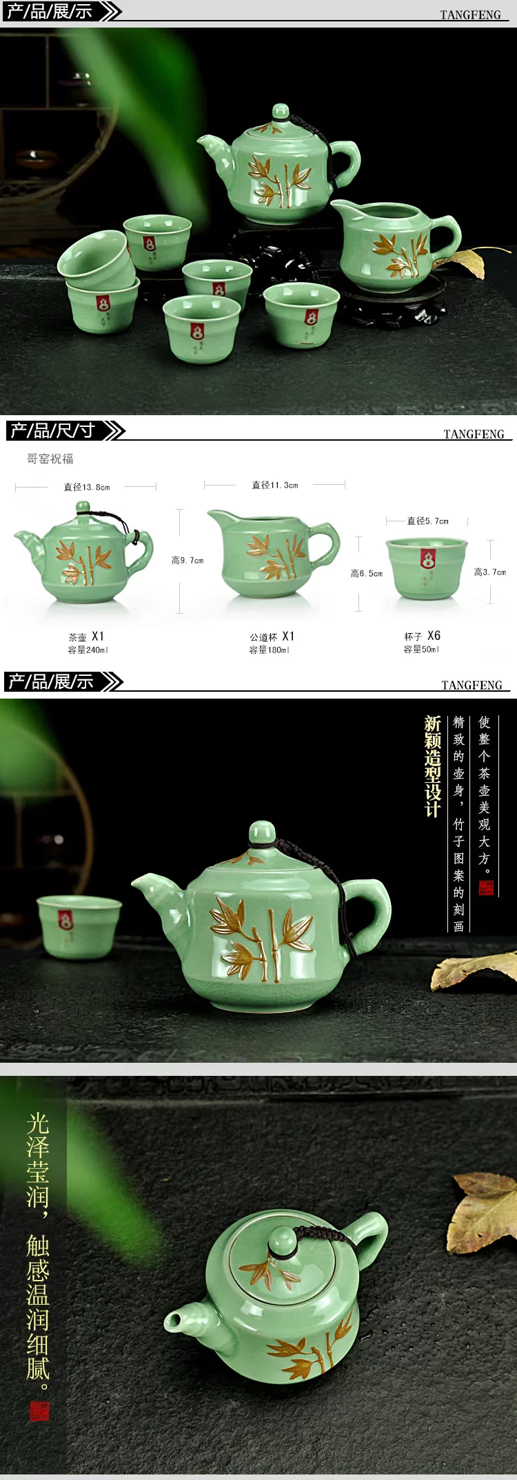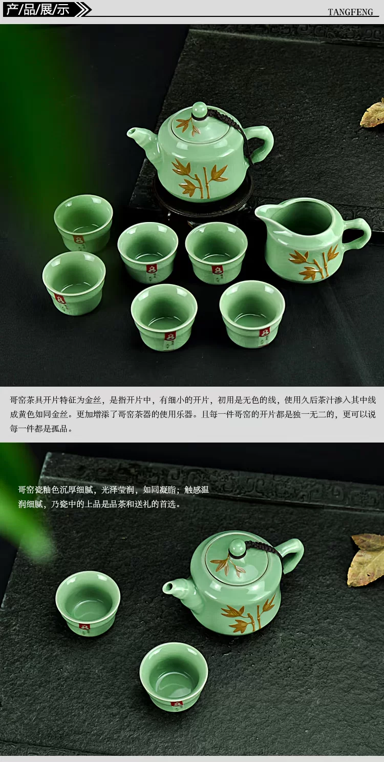 3.哥窑茶具价格适中,做工精细,是居家品茶,会客待友送礼之时的品味首选。哥窑茶具不仅泡茶茶香浓厚而且茶具釉厚如脂,光莹鲜艳,胎质细腻坚致,光滑美观。是泡茶、饮茶之佳品,长时间的使用哥窑茶具的开片更加光泽美观,更具有收藏意义和价值所在。