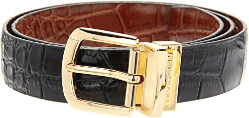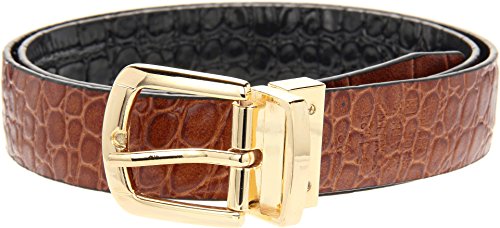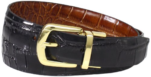Reversible black or cognac croc embossed leather with festher edge and gold twist buckle