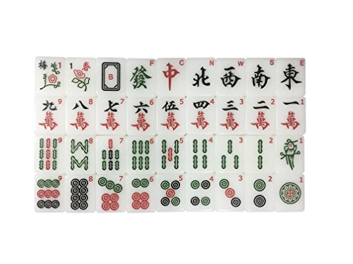 144 premium tiles: 36 Dots, 36 Bams, 36 Cracks, 28 Winds, 8 Flowers, and 4 Blank Spares. Each set comes with 3 large dices.