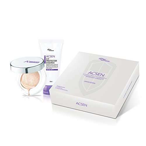 -. Feature : More than 30% Valuable Bundle Pack Kit (ACSEN A+Cushion 13g + ACSEN UV Protector Essence 50ml) / ACSEN line has been developed for skin professionals to improve the sensitive and acne prone skin. / A+ Cushion : UV protection+Cover+Calming+Adhesion+Water Wrapping System / Sun essence(SPF 50/PA+++) : Anti-Pollution, Fresh and Light texture as skincare essence / How to Use : Apply daily for UV protection(Sun essence)+Use makeup pad to cover the area softly(A+ Cushion)