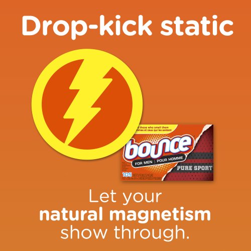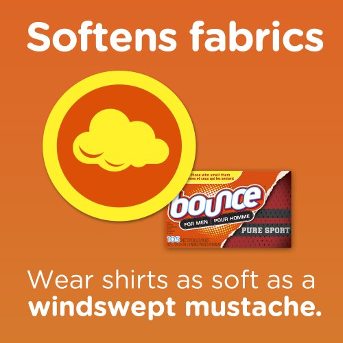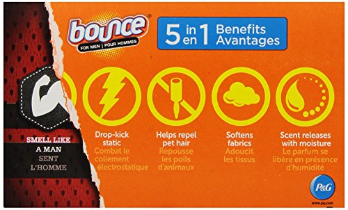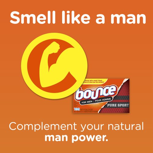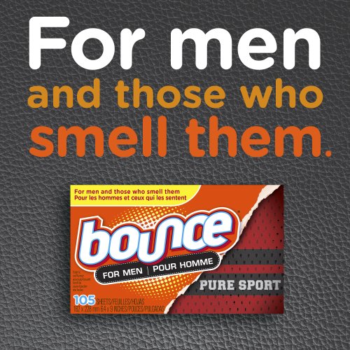 Studio : Bounce Publisher : Bounce Binding : Health and Beauty Product Description Even if you can't whittle a kayak out of a redwood with a penknife, you can smell like the sort of guy who could. With Bounce for Men, our first ever laundry product for men, you can have confidence knowing that you smell like the right man for the job. Adding Bounce for Men Pure Sport to the dryer not only adds softness and fights lint, it infuses clothes with a clean, fresh, sporty scent. The next time you fold your clothes, take a deep breath and revel in the sweet smell of success. 0