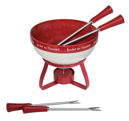 Delight friends and family with this bright strawberry colored chocolate fondue set.This charming set includes everything you need to enjoy fondue dipping: 1 porcelain bowl 4 stainless steel fondue forks 1 metal base 1 matching tea light candle. The set comes attractively packaged and will make a great gift. 4 inches h. on base, Bowl 4.75 inches diam.