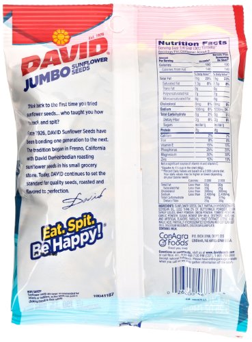 -. Feature : Contains one (1) 5.25-ounce bag of DAVID SEEDS Ranch Jumbo Sunflower Seeds / Grab a bag of DAVID SEEDS Ranch Jumbo Sunflower Seeds and savor the rich, roasted ranch flavor / Sunflower Seeds are full of nutritious unsaturated fats, protein, fiber, minerals, folic acid, vitamins and phytochemicals / Each ounce of DAVID SEEDS Sunflower Seeds provides only 4 grams of carbohydrates, two of which are fiber / When regular-size sunflower seeds just won't do, grab a bag of our JUMBO seeds. Bigger is better / Saddle up and savor our rich, roasted Ranch flavor. / Each serving of David Sunflower seeds provides a good source of vitamin E. / A great snack choice at the game, on-the-go or anytime you crave a fun, tasty snack!