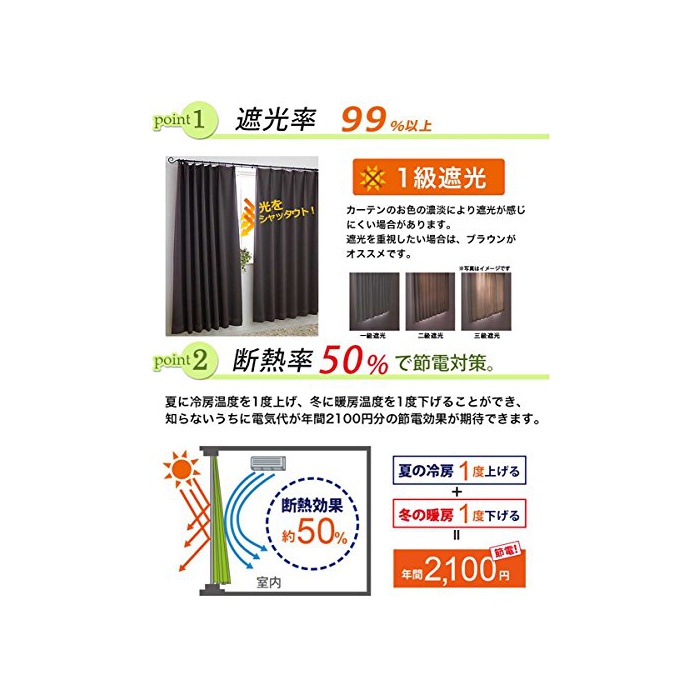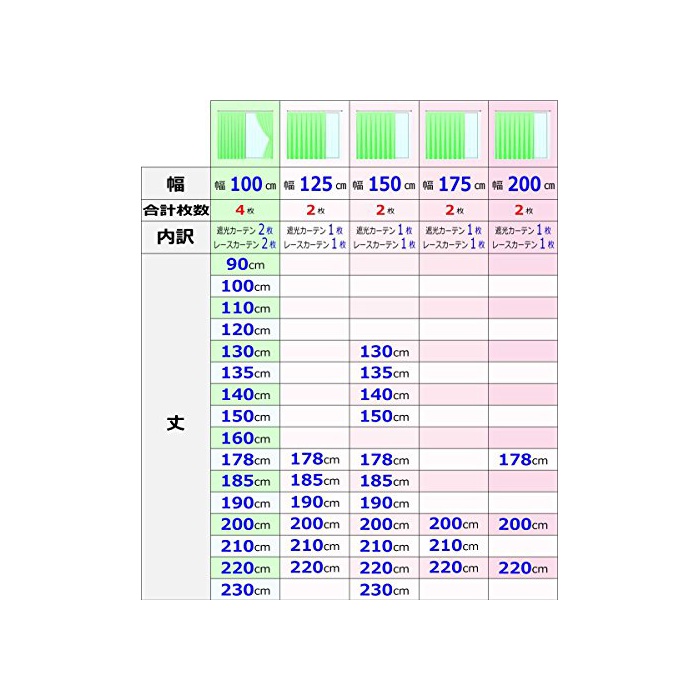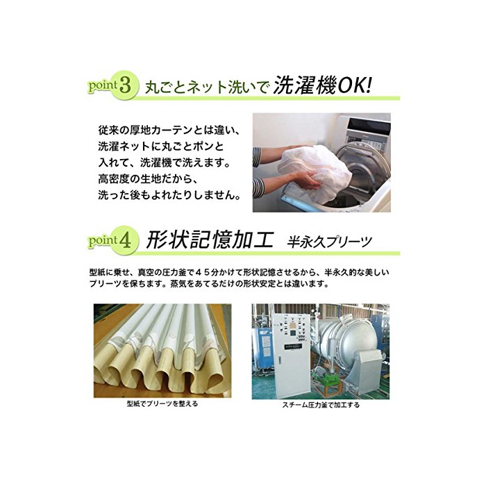 【사양】차광 등급:1급,형상 기억 가공필,세탁가,차광 커튼1매에 대해서《닷세루》1개 부속,adjusterA훅부(-3cm~+1cm까지 조정 가능)고, 1.5배《히다》,폭100cm이외는 호주상속인 있고, 폭100cm은 커튼2매와 레이스2매의 4 매세트,폭125cm~200cm은 커튼1매와 레이스1매의 2 매세트