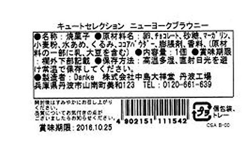 原材料:卵、チョコレート、砂糖、マーガリン、小麦粉、水あめ、くるみ、ココアパウダー、膨脹剤、香料、(原材料の一部に乳、大豆を含む)