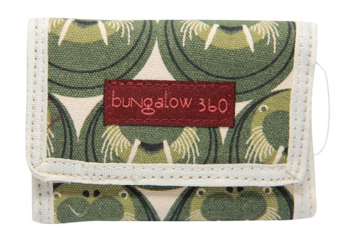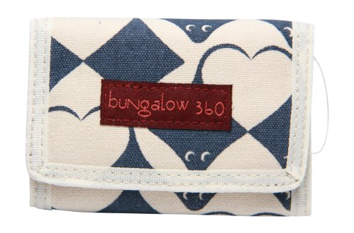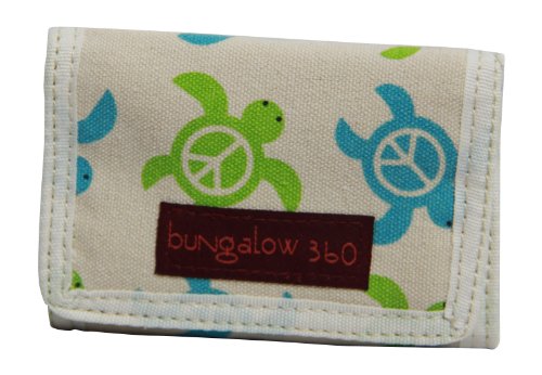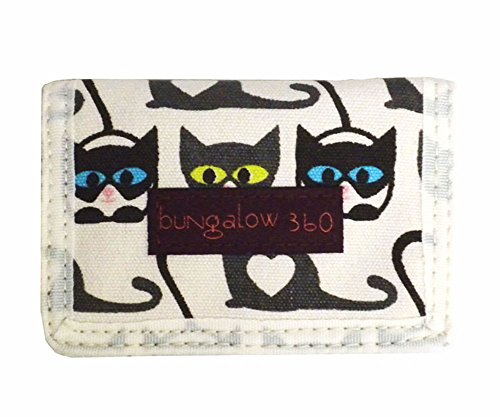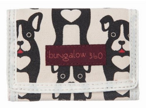 This new cute Bungalow 360 tri-fold wallet printed on natural canvas. The velcro closure closure opens to a zippered coin pouch, two pouches, and full sized bill slot lined with black and white polka dot fabric.