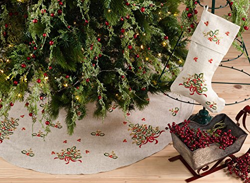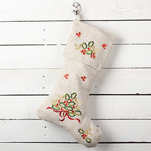 Fennco Styles Embroidered Holly Design Decorative Linen Blend Christmas Stocking (7"x15" Stocking)