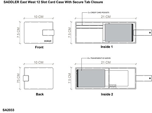 SADDLER is the quintessentially British Leather Goods Brand that traces its heritage back more than 25 years. Every SADDLER piece combines the finest leathers handcrafted by experienced artisans employing traditional leather skills with creative design and eye-catching colour that makes any SADDLER piece an ideal real leather gift. The SADDLER Essence Collection bears all the hallmarks of excellence across a comprehensive range of ladies accessories destined to impress those with the most discerning tastes. The outer flap of each piece is distinctively embossed with the SADDLER logo and the interior is lined with SADDLER monogrammed woven jacquard lining. High quality fittings are used to enhance the natural beauty of these full grain cowhide wallets and, as a finishing touch, the Saddler Essence range is delivered to you in its own innovative gift packaging. The East West 12 slot credit card case features a secure tab closure that opens to reveal 2 credit card slots on the main body of the case with a further 10 page detachable credit card case in a luxury embossed PVC. The front is has a discreet SADDLER emboss motif on the front and the interior is finished with SADDLER monogrammed lining. Approximate Size: 4" x 3" x 1/2" when closed and without packaging and weighs approximately 2 ounces when empty.