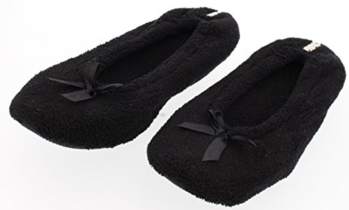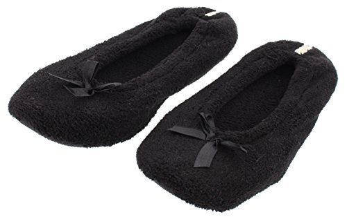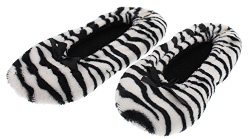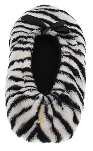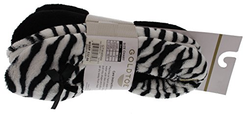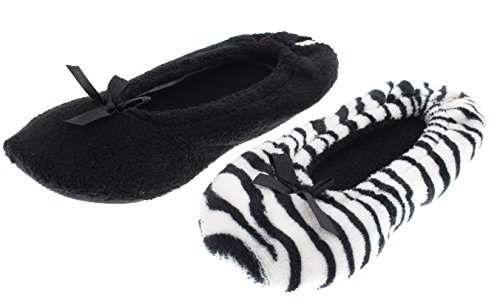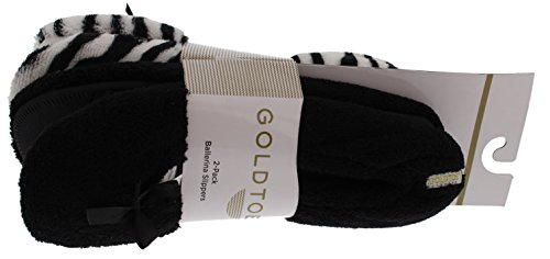 Binding : Apparel Product Description GoldToe women's classic ballerina slippers in a two pair value pack. One pair is solid black and one is classic zebra stripes. The soles are suitable for light outdoor wear too. They are also slip resistant. The slippers are available in sizes small through x-large. They fit the following US women's shoe sizes: Small fits a 6/7 women's shoe size Medium fits an 8 women's shoe size Large fits a 9 women's shoe size X-Large fits a 10/11 women's shoe size. The slippers are 100% manmade materials. They can be machine or hand washed and layed flat to air dry. Slippers make the perfect gift, especially for Mother's Day. They are always needed and appreciated. 0