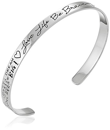 Slender sterling silver cuff bracelet engraved with hearts and inspirational messages, such as "DREAM BIG!" and "Love Life Be Brave"