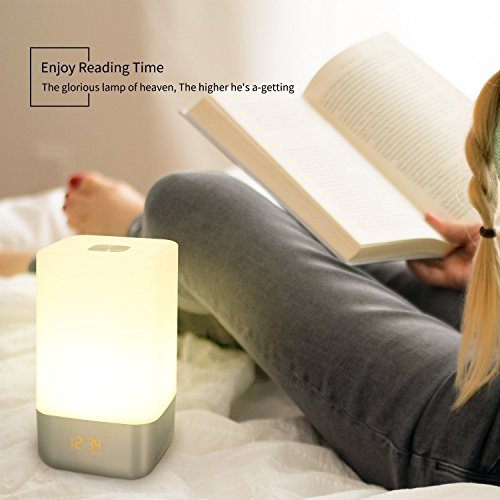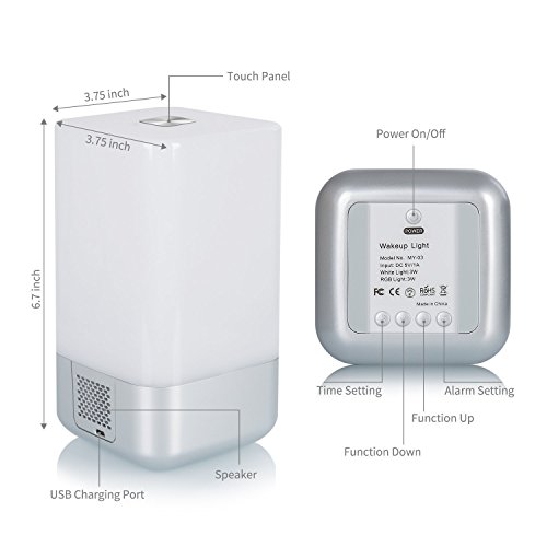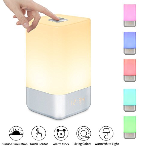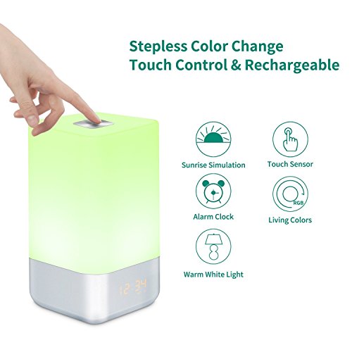 - WAKE UP LIGHT - re upgraded touch control and Simulated Sunrise Wake up Light, rechargeable version wake up lamp with sunrise simulation, 20 Intensity of the Warm White light. 30 minutes before your alarm time, the light brightens gradually from 1% to 100%, gently brings you out of deep sleep