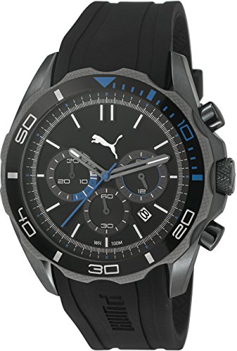 This PUMA Motor Sport unisex watch has a black dial with baton markers, chronograph sub dials and a date display. It is set in a stainless steel case with a plastic strap fastened with a pin buckle.