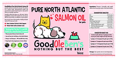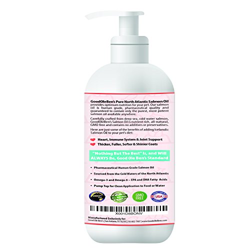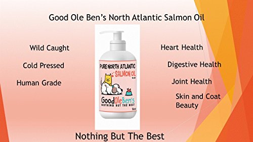 -. Binding : Misc. -. Brand : Good Ole Ben's -. Feature : HEALTH BENEFITS: Supports immune, heart and joint health / BEAUTY: Dog and cat skin and coats will noticeably improve with regular use / OMEGA FATTY ACIDS: University study showed dogs fed omega 3 showed significant improvement in gait and activity scores. Source: University of Montreal Department of Veterinary Biomedicine. / 100% Money back guarantee. If for any reason you want to return we will accept / ODORLESS: Good Ole Ben's Salmon Oil for Pets is deodorized. Humans cannot smell however pets do and love it. -. Label : Good Ole Ben's -. Manufacturer : Good Ole Ben's -. PackageQuantity : 1 -. ProductGroup : Pet Products -. ProductTypeName : PET_SUPPLIES -. Publisher : Good Ole Ben's -. Studio : Good Ole Ben's -. Title : Pure North Atlantic Salmon Oil for pets. Pets are family so give them Good Ole Ben's "Nothing But The Best". Supports heart, immune and joint health. Packed with Omega Fatty Acids.