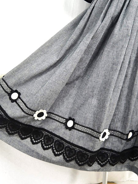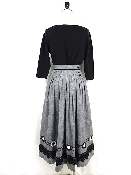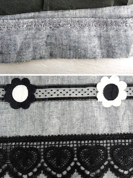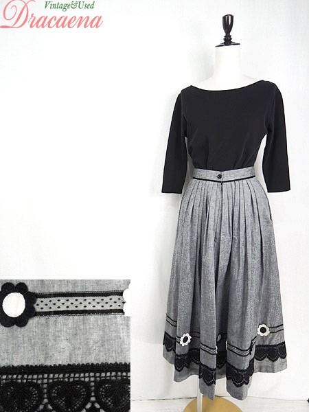 裾にクロシェレース、フラワー刺繍ワッペンなどガーリーな要素がたくさん詰まったスカートです。モノトーンなので甘すぎず、色んなトップスに合わせやすいです◎。薄手のコットンのような素材感です。ウエストにチャーム付き・裏地あり・裾のフラワーワッペンのひとつに変色あり