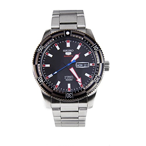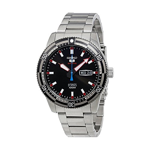Stainless steel case with a stainless steel bracelet. Uni-directional rotating stainless steel bezel. Black dial with luminous hands and index hour markers. Minute markers around the outer rim. Dial Type: Analog. Luminescent hands and markers. Day of the week and date display at the 3 o'clock position. Automatic movement with a 40-hour power reserve. Scratch resistant Hardlex crystal. Case size: 44 mm. Case thickness: 13 mm. Round case shape. Band width: 22 mm. Fold over clasp with safety release. Water resistant at 100 meters / 330 feet. Functions: date, day, hour, minute, second. Casual watch style. Seiko 5 Sports Automatic Black Dial Mens Watch SRP735.Feature