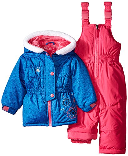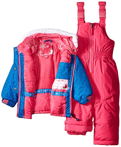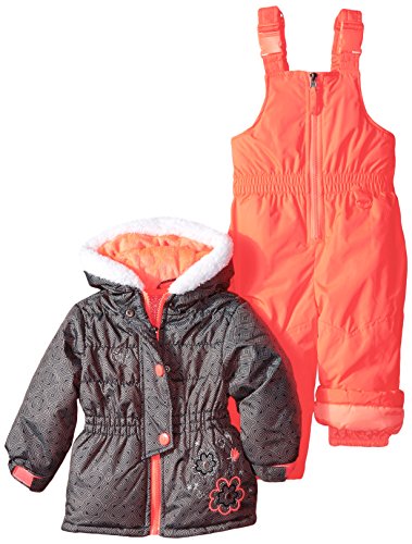 Two piece snowsuit set. Hooded jacket with floral applique.
