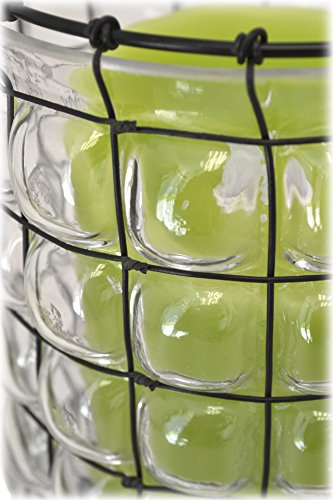 -. Feature : Indoor/Outdoor Lantern / Clear Hand Blown Glass encased in Wire Cage / Cylinder Shaped with Hobnail Style Glass / Metal Wire Handle / Approximate Size: 6.75" x 5" x 5"
