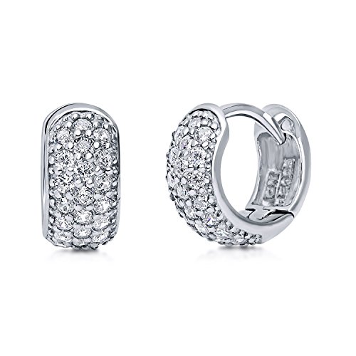 These huggie earrings will be the talk of the town as soon as you step out. Made of rhodium plated fine 925 sterling silver. Set with 0.69 carat round cut clear cubic zirconia (1.5mm) in pave setting. Earrings measure 0.2 inch in width, 0.5 inch in diameter. Hinged snap backs. Imported.