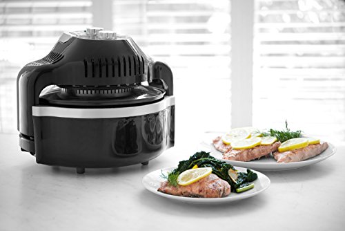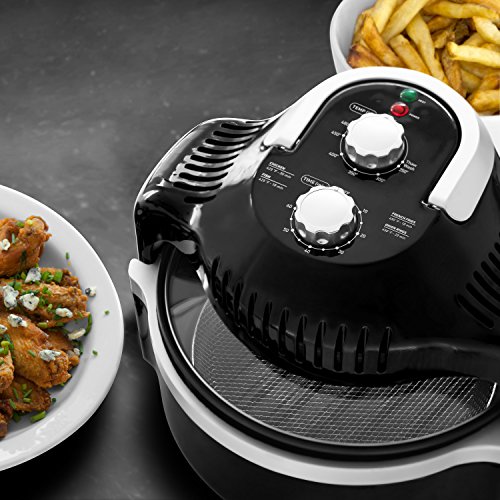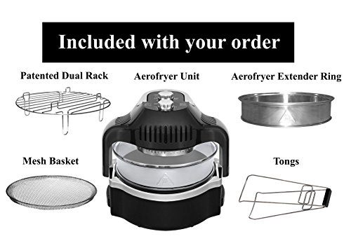 NO NEED FOR OIL: Prepare crispy and fried dishes with NO oil.;TRIPLE COOKING POWER : halogen, convection, infrared heat; browns the food on the outside while keeping the insides smooth and tender;ADJUSTABLE TIMER: just set required time to cook food, and walk away; the Aerofryer also quickly cooks from frozen - no thawing time needed;ADJUSTABLE TEMPERATURE & EFFICIENT: heats up to 480 degrees; Uses less energy, and cooks up to 3 times faster;FREE: Recipe Book, Handy Tongs, Patented Dual Rack, Mesh Basket, and the Aero Extender Ring.
