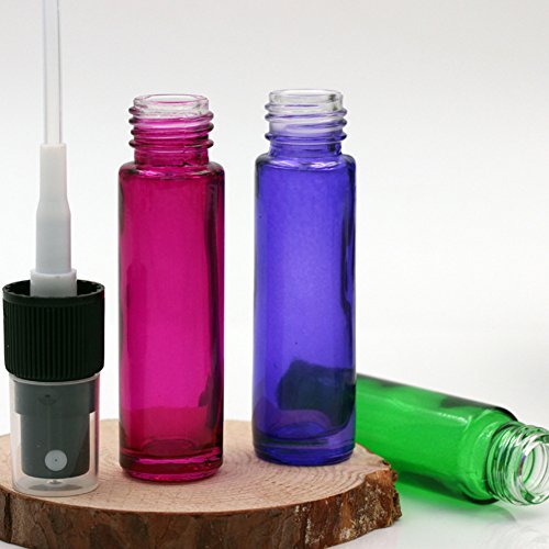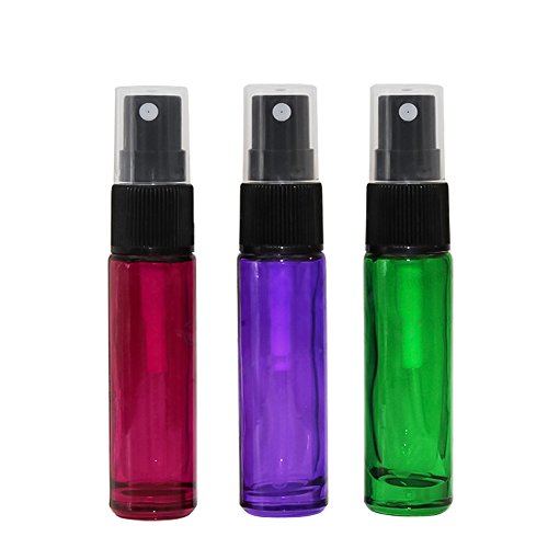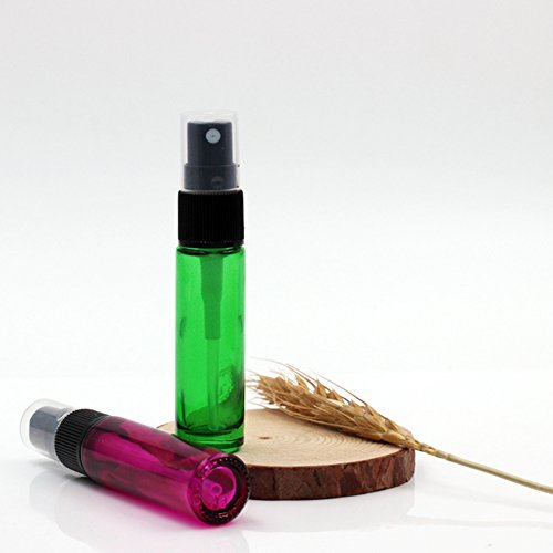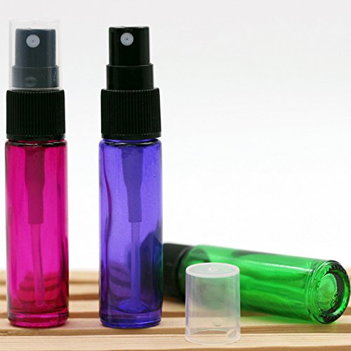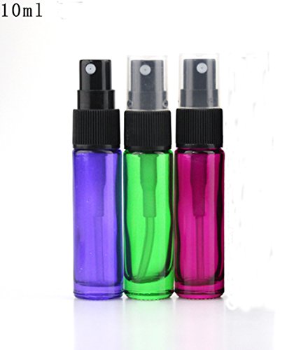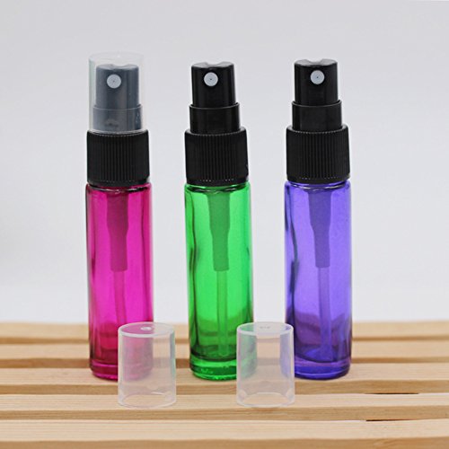 - Set of 10: Colorful cute Glass Bottles, with Black Fine Mist Sprayers,and Transparent Dust caps.