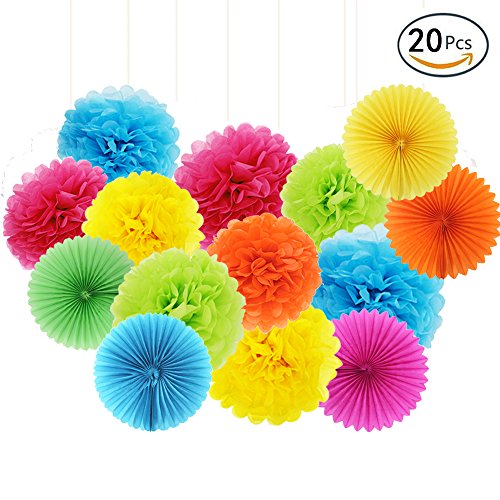 - Package includes: 15 paper pom poms and 5 paper folding fans; Product color: orange, lemon yellow, hot pink, blue and green.