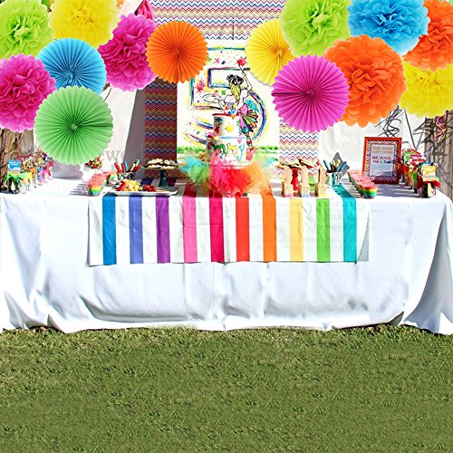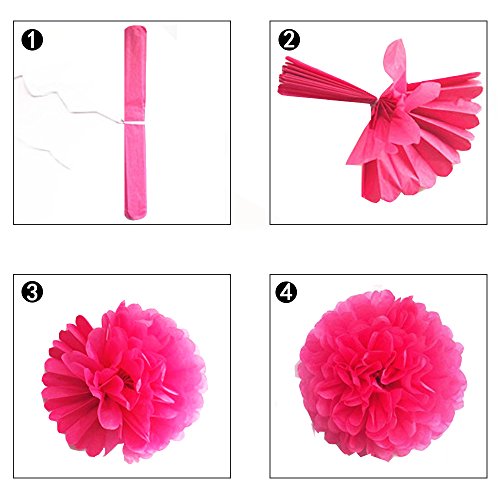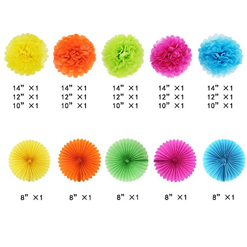 - Product Size: Paper pom poms have 3 different sizes (10 inch, 12 inch, 14 inch), 3 sizes per color. Paper folding fan size is 8 inch in 5 different colors.
