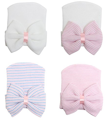 Gellwhu Pink White Blue Newborn Girl Nursery Beanie Hospital Hat With Large Bow (4 Colors Pack E)