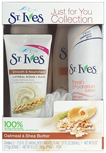 -. Feature : Contains: 2-oatmeal and shea body washes, oatmeal facial scrub, soothing oatmeal and shea spray lotion and bath pouf / Makes a great gift for students, girlfriends, sisters and friends / Wrap your skin in soothing hydration with this ultra-moisturizing St. Ives oatmeal shea body wash