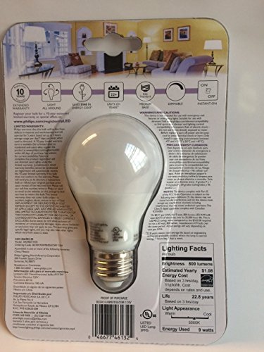 Studio : Phillips Publisher : Phillips Product Description Philips LED A-shape light bulbs are a smart alternative to standard incandescent and designed to deliver everyday value and effective, consistent light. This Philips 8-Watt LED A19 household light bulb is the perfect replacement for anywhere traditional light bulbs are used, such as table or floor lamps. This 8-Watt 5000K (Daylight) LED A19 provides a light similar to natural daylight, perfect for your living room, bedroom, kitchen or any place in your home where you would use a standard incandescent light bulb. The Philips LED A19 household light bulb provides 360 Degree all around light and can replace your current 60-Watt light bulb. Lumens per watt: 100 Functional light quality, designed to deliver everyday value without compromising in performance Ideal for any room in your home such as bedrooms and living rooms Use in table or floor lamps, or anywhere traditional light bulbs are used Light creates a light similar to natural daylight, which is great for a variety of tasks around the house 0
