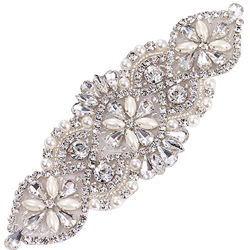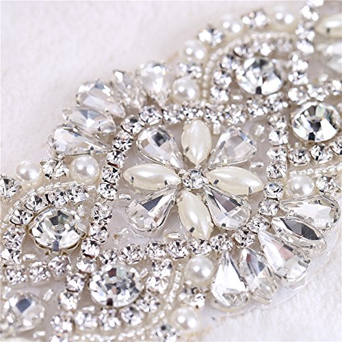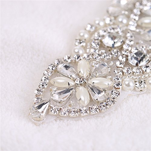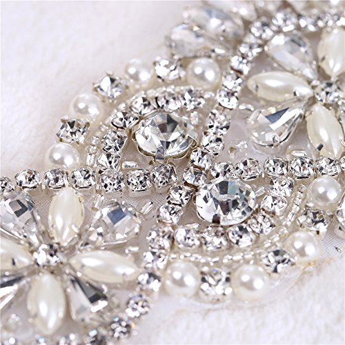 FANGZHIDI Small Bridal Sash Belt Rhinestone Applique with Pearls Stones Beads for Wedding Dress Bridesmaid Gown Party Prom Headpieces Handbag Garter Iron on Sewing(2 Ribbons)