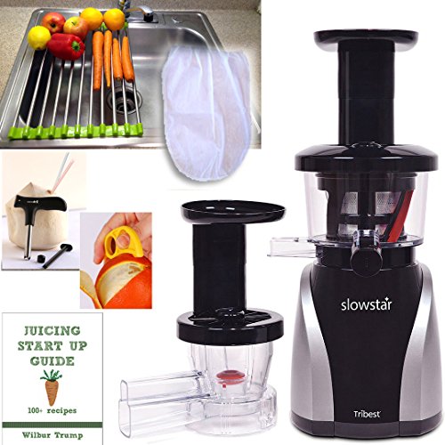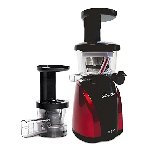 Tribest Slowstar Vertical Slow Juicer and Mincer is a quiet single auger juicer that slowly and easily juices your favorite fruits and vegetables from apples to oranges to carrots and leafy green. The Slowstar has a low speed of 47 RPM with a 200 watt motor and 3 reduction gears - the equivalent amount of torque as a 9 HP motor, creating more than twice the power compared to similar slow juicers that run at 80 RPM with 150 watt motor, which produces a 4HP equivalent. The low 47 RPM ensures that you will not lose the freshness, quality and enzymes in your juice due to friction and heat. The Double-edged Duoblade Auger makes it possible for the Slowstar to rapidly cut and juice your produce at a low speed for higher yields and reduction of pulp in the juicer. Mincing attachment turns Slowstar into a multipurpose tool that allows you to create your favorite recipes sorbets, nut butters, pate sauces.