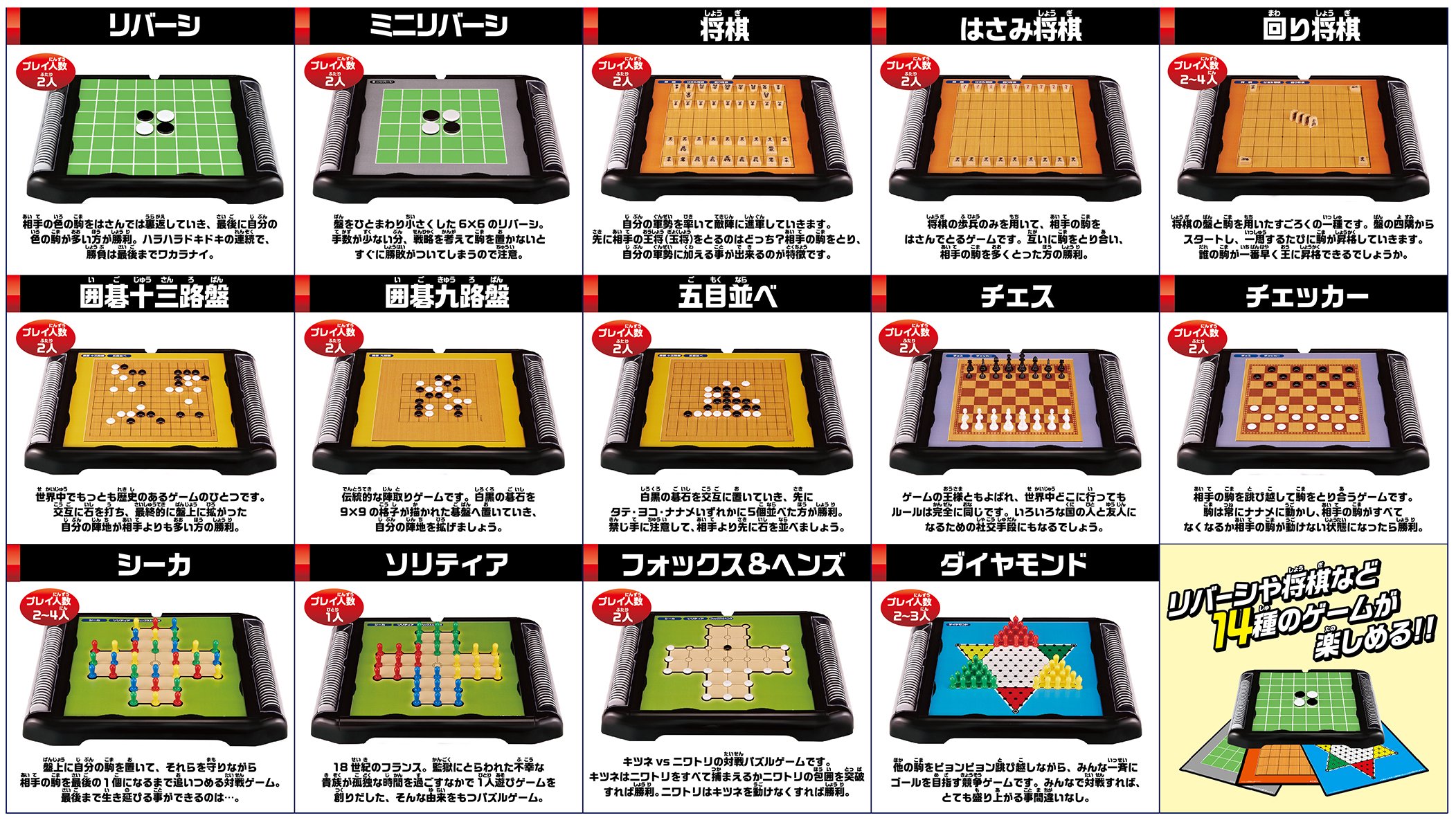 It is a game set that you can enjoy 14 kinds of games including Reversi, Shogi, Go etc.