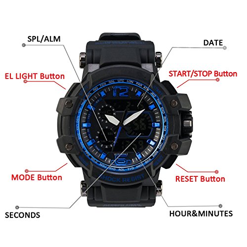 -. Feature : Daily water resistance to 30m (please don't press any keys when underwater, or it will not work any longer) / Japanese quartz movement, Date/Day/EL Back light/Alarm/Stopwatch/Time/Analog Digital dual time / Dual Dial Sport Design: dual dial display, shock resistant, stop watch, and EL back light function with sport fashion design and simplicity / Comfortable to wear, ABS Plastic & PU Plastic Watch Case, safety to wear and fit for all kinds of activities / Warranty: 12 months warranty and friendly customer service, Any problem please feel free to contact our customer service