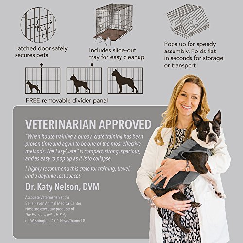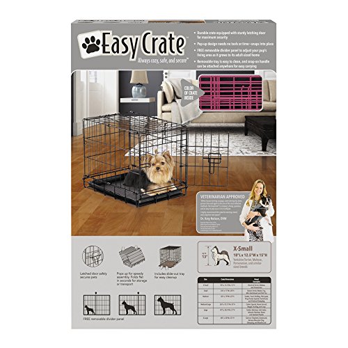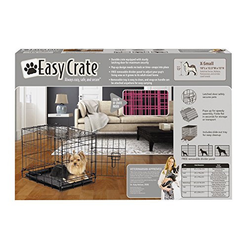 Studio : PetEdge Dealer Services Publisher : PetEdge Dealer Services Binding : Misc. Product Description A bargain-priced dog crate that's easy to use, clean, move, and store. ProSelect Easy Crates are wire dog crates with dual latching doors on most sizes. Lightweight, folding crates have a top handle for easy transport. ProSelect Easy Crates are easy to use and easy on the wallet. Each wire crate comes complete with a dual latching door to safely secure pets (except X-Small 18"L) Folds for effortless storage or travel Includes a slide-out, easy-clean floor tray and a removable divider panel Easy Crates are available in a range of sizes from extra small to extra large. Assembly instructions included. Material: Lightweight wire crate Size: X-Small Crate measures 18"L x 12 1/2"W x 15"H (includes only one latch) Small Crate measures 24"L x 17"W x 20"H Medium Crate measures 30"L x 19"W x 22"H Medium/Large Crate measures 36"L x 22 1/2"W x 25"H Large Crate measures 42"L x 28"W x 31"H X-Large Crate measures 48"L x 30"W x 33"H Care: Wipe clean with a damp cloth Note: All sizes come with a dual latching door except the X-small. Sizing Guide: Measure dog’s height to the shoulders, and length from chest to rear of leg, then add 4"-6" to each measurement. See below for estimations by breed. For approximation only. X-Small: Cat, Yorkshire Terrier, Chihuahua, Maltese, Italian Greyhound Small: Beagle, Boston Terrier, Cocker Spaniel, Pug Medium: Basset Hound, Bulldog, Keeshond, Norwegian Elkhound, Dalmatian Medium-Large: Boxer, Standard Poodle, Golden Retriever, Labrador Large: Afghan, Doberman, German Shepherd, Irish Setter, Rottweiler, Collie X-Large: Great Dane, Great Pyrenees, Greyhound, Mastiff, Saint Bernard. 0