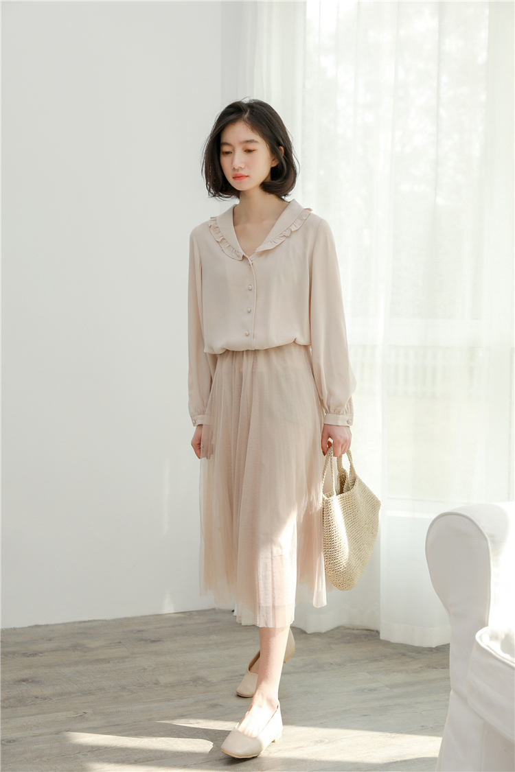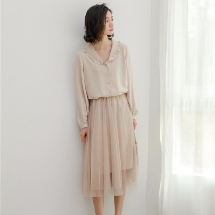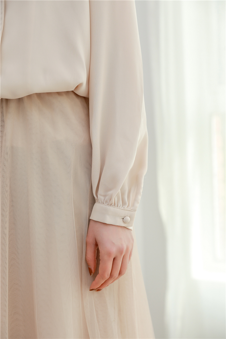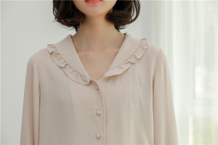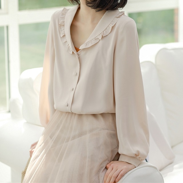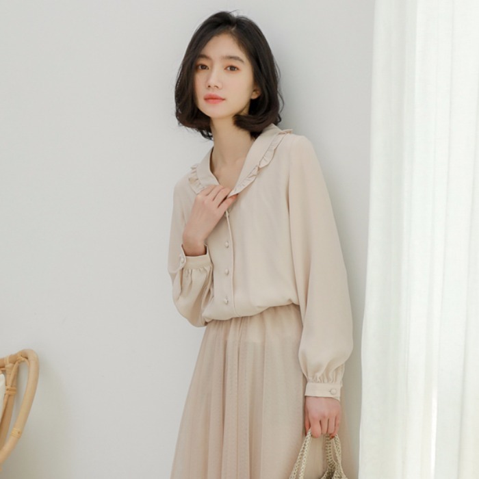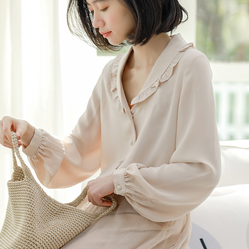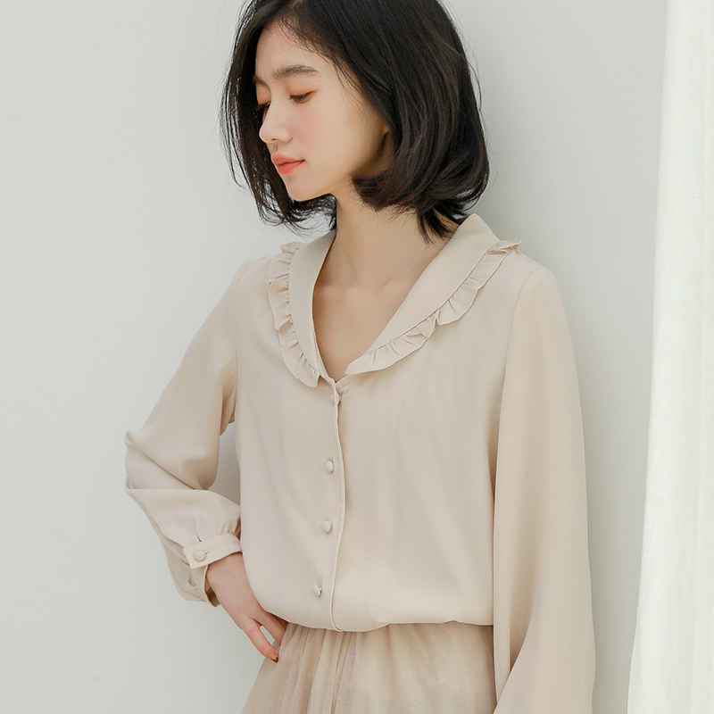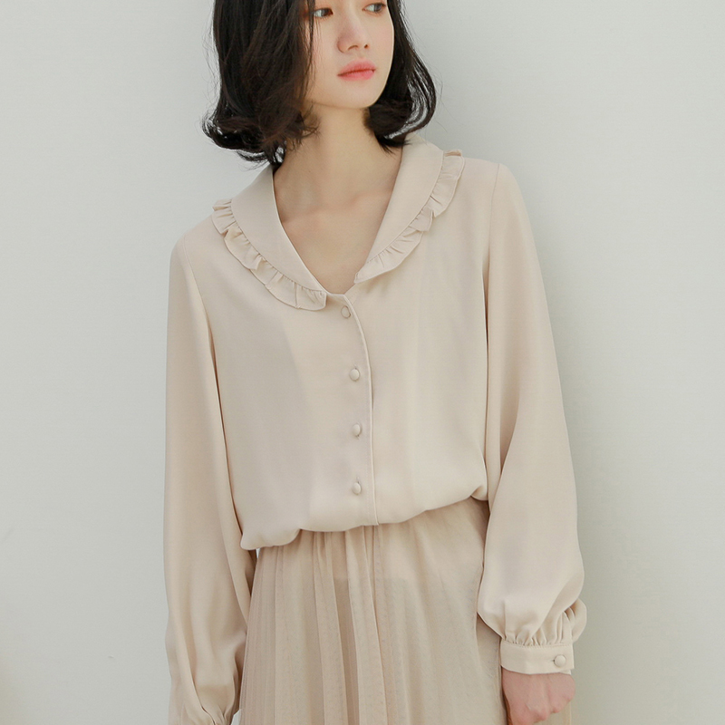 襟元にあしらったプチフリルが上品で可愛らしい着こなしをアシストするブラウスです。