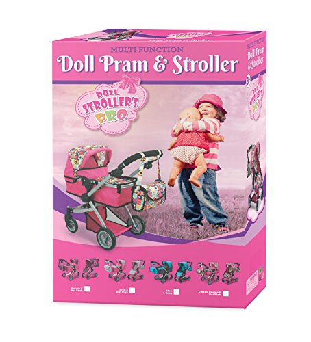 -. Binding : Toy -. Brand : Doll Strollers Pro -. EAN : 0687077255603 -. Feature : Looks just like Mom's Stylish Bugaboo Stroller, Little ones will love taking their favorite doll for a stroll in this doll-size stroller / Handle can be moved so the dolls can face your child or face the street. Handle can be adjusted up to 27.5''H 13''W and 27''L / Easy fold, body is fully assembled all you need is to put the wheels on (Less then 1 min) / Fits up to a 18'' doll, Basket in the bottom, Opening and closing hood / Fabric is removable and machine washable. Item is tested with all safety testing (like led and other child safety) -. IsAdultProduct : 0 -. Label : Doll Strollers Pro -. Manufacturer : Doll Strollers Pro -. MPN : LYSB014JV44UC-TOYS -. PackageQuantity : 1 -. PartNumber : LYSB014JV44UC-TOYS -. ProductGroup : Toy -. ProductTypeName : TOYS_AND_GAMES -. Publisher : Doll Strollers Pro -. Studio : Doll Strollers Pro -. Title : Deluxe Doll Pram with Swiveling Wheels & Adjustable Handle and Free Carriage Bag -. UPC : 687077255603