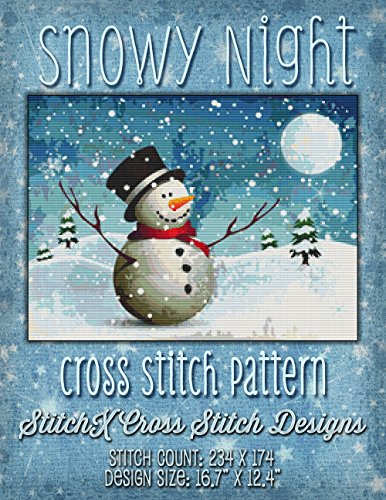 Snowy Night Cross Stitch Pattern - Cute Whimsical Snowman Among Snowflakes in Winter