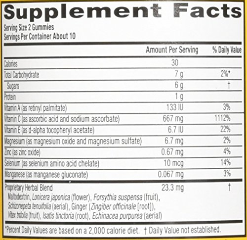 ReleaseDate : 2015-03-19 Studio : Airborne Publisher : Airborne Binding : Health and Beauty Product Description Airborne Immune Support Gummies for Kids supplements provide real immune support in a delicious, and easy-to-take gummy form kids love. No longer do you need to fight with your kids to take them. Each serving (2 gummies) delivers a blast of 667 mg of Vitamin C plus 9 other immune system supporting vitamins, minerals, and herbs, including Echinacea, ginger, and other herbal extracts from whole plant materials.* Children 4 years and older, take 2 gummies daily. Chew thoroughly before swallowing. Note for younger children du eto risk of choking. *These Statements have not been evaluated by the Food and Drug Administration. This product is not intended to diagnose, treat, cure or prevent any disease. 0