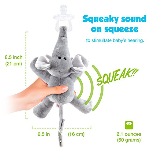 - Feature : 4 in 1 Must-have accessory for your baby - soft and soothing stuffed animal toy, removable one piece 100% silicone premium binky, durable childproof clip holder and squeezable squeaky sound. / 100% SAFE, made from non-toxic, BPA & Phthalates free, Lead free, high-quality materials. Taste and odor free dummy, convenient and comfortable for babies to accept and easy to transition between pacifier, breast and bottle when breastfed. Many mothers that breastfeed exclusively have used it successfully. / Super cute and cheerful buddy during the day and a soft bedtime companion during the night, designed to calm your baby and bring him soothing comfort and security for a better sleep. / The best Baby Shower Gift and the perfect time saver for parents. It clips easily to baby's clothing, car seat, stroller, baby carrier, sling, bib, straps, blanket etc., always keeping it within reach and off the floor, away from falling and getting dirty and away from dangerous and unwanted viruses, bacteria or germs. / Orthodontic silicone pacifier that can be easily removed and replaced with any of your baby's favorite brand, such as Philips Avent, Nuk, Dr. Brown, Gumdrop, Nuby, Munchkin, Mam Air, Chicco, Playtex, Gerber, Tommee Tippee, Hevea, Nip, Billy Bob, Evenflo etc. and many others with adapters: Mam Preemie and other Mam binkies, RazBaby, JollyPop, Camo etc.