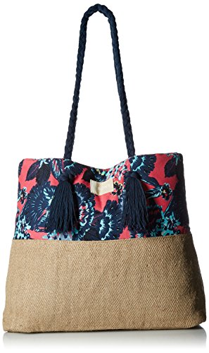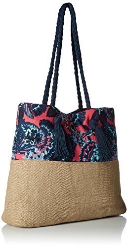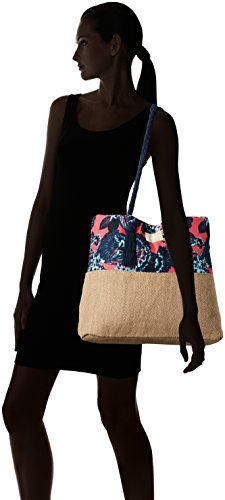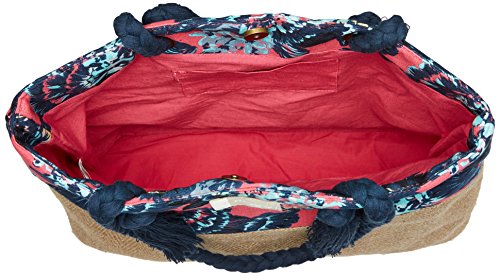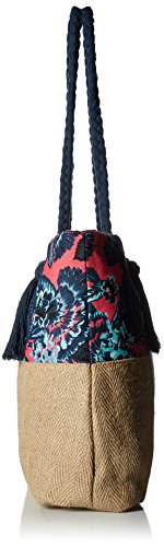 Shoulder bag for women. Features include: poly-canvas and jute fabric, magnetic snap closure, adjustable cotton drawcord with tassels, Roxy cotton patch, size: 14.8 [h] x 16 [w] x 4.8 [d]/37 [h] x 40 [w] x 12 [d] cm and volume: 17.5 l.Feature