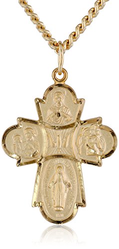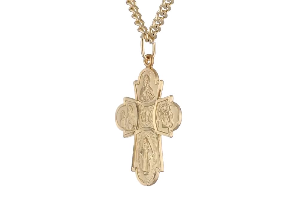 14k gold-filled cross necklace with four-way design showcasing depictions of the Sacred Heart medal, Saint Joseph medal, Saint Christopher medal, and Miraculous medal