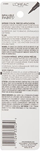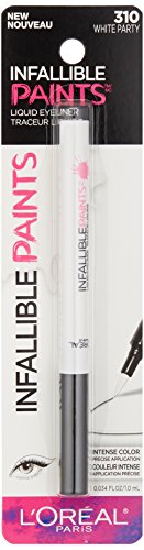 Paint it loud with L'Oreal Paris Infallible Paints Eyeliner, 0.1mm felt tip for liquid eyeliner precision. Define and design eyes with total control using one or multiple colors. Long lasting liquid eyeliners. High Impact Color, All Day Wear. • Precision Tip • high impact eyeliner paint • Long lasting liquid eyeliner • Extensive Shade Range: Black Party, White Party, Electric Blue, Vivid Aqua, Intrepid Teal, Wild Green Apply along upper lash line, as close to lashes as possible, starting from inner corner of eye working outwards. Repeat underneath the lower lash line. Use multiple shades of Infallible Eyeliner Paints for an even more vibrant eye look. Warning: Eye cosmetics in a scratched, infected or irritated eye and scratches from cosmetic eye applicators can lead to eye damage, and in extreme cases, even blindness. If your eye is scratched, stop using all eye cosmetics and go to an ophthalmologist immediately. Never apply this product in a moving vehicle.Feature