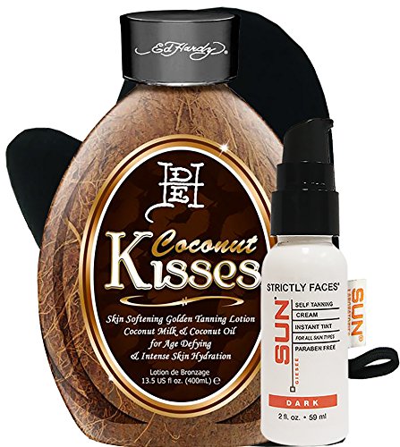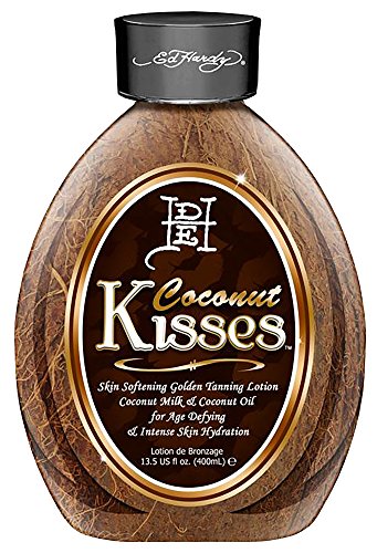 Ed Hardy Coconut Kisses: Golden Tanning Lotion With Coconut Milk & Coconut Oil Tanning intensifiers deliver dark golden results without the use of bronzing agents.Quad Tyrosine Blend + MelanoBronze: Stimulate and increase melanin formation to accelerate the tanning process.Melactiva: Melanin synthesizer for darker, longer lasting results. BodyFit: Reduces the appearance of cellulite and promotes firmness.