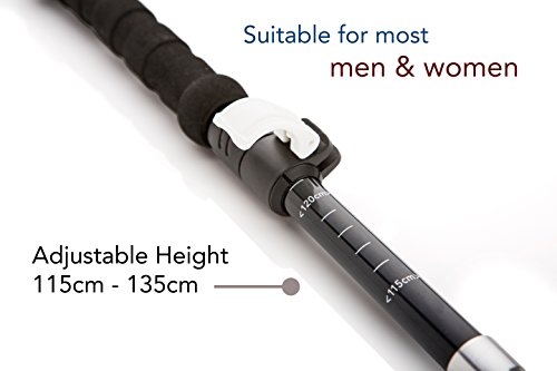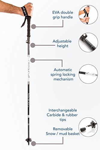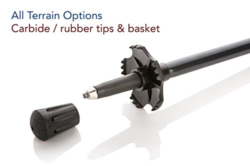 Technical Qualities - EVA non-slip double length foam grip - Interchangeable rubber / carbide tips for altering ground conditions - 360 degree padded webbing strap - Rip stop fabric carry case for travelling - Quick lock assembly mechanism - Length adjusting clip - Snow / Mud screw on basket for soft conditions Full Product Quality Guarantee 0