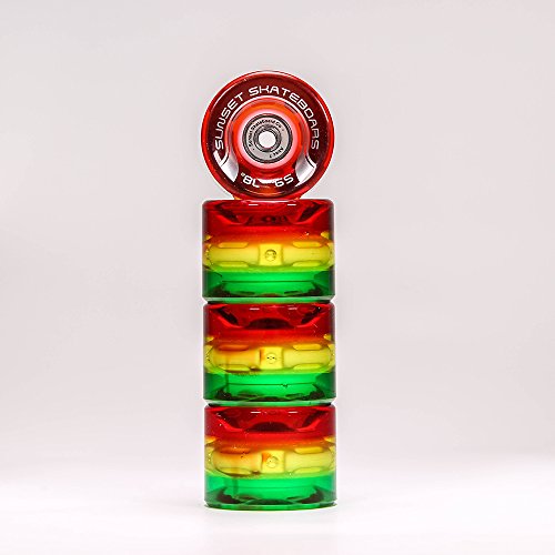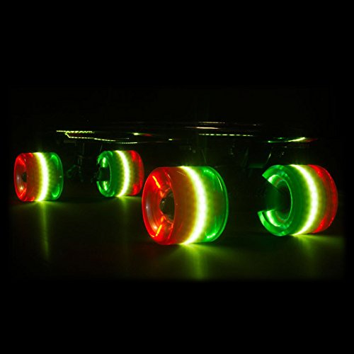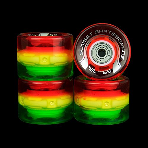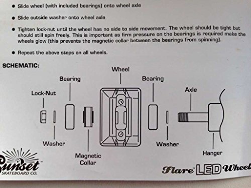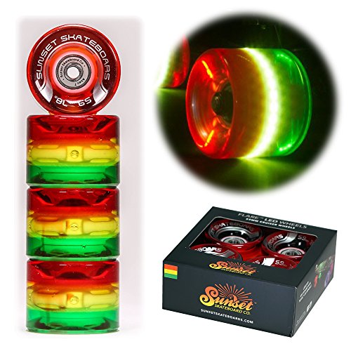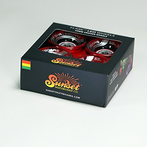 Binding : Misc. Product Description Stand out and be seen 24-7 with our signature Sunset Flare LED wheels. Four ultra-bright WHITE LEDs illuminate the wheel's 3-layer red yellow green urethane bringing ANY skateboard to life day or night. Our 59mm Cruiser Wheel has a performance conical shape and a 78a soft durometer, allowing for smooth cruising on the streets or even rougher asphalt surfaces. Our Sunset LED Wheels offer the brightest LEDs in the industry and have the capacity to glow for a staggering 100,000 hours. Batteries... NOT! Our LED wheels self power off the spinning motion of the wheel, therefore no batteries are ever required. Each wheel is printed with our Sunset Logo branding. Sunset Flare LED Wheels and Skateboards are Protected by US Patent Numbers 9188295, D733241, D738450, D750187 0