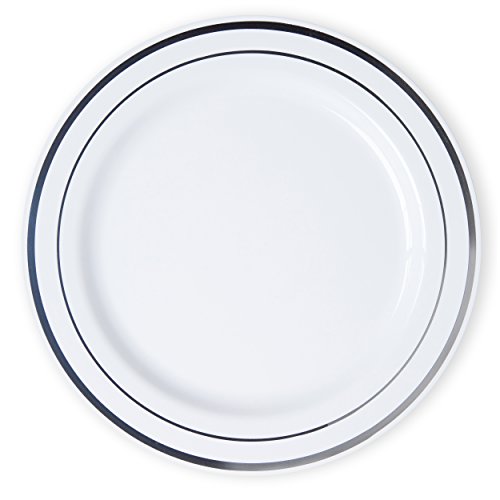 Studio : Aya's Cutlery Kingdom Publisher : Aya's Cutlery Kingdom Product Description DINE IN ELEGANCE Hosting a fancy event? Need to serve a crowd? Cutlery Kingdom has got you covered. This Disposable Plates Set by Cutlery Kingdom equips you with 10.25 inch dinner and 7.5 inch salad / appetizer / dessert plates, for a total of 60 pieces to serve 30 guests. Crafted from heavyweight plastic, these plates have a durable build that can hold any food, as much as you like. Their high gloss finish, however, more closely resembles real china. The silver rims accentuate with a classy touch. Dine and serve in elegance! PRODUCT FEATURES: ? White Glossy Finish ? Silver Rim ? Real China Look ? 60 Piece Pack ? 30 10.25" Dinner Plates ? 30 7.5" Appetizer / Salad / Dessert Plates ? Serves 30 People ? Not Dishwasher or Microwave safe DURABLE DESIGN Unlike disposable plastic plates that are thin and flimsy, Cutlery Kingdom uses premium heavyweight plastic for pieces as strong as real dishes. Feel free to pile all your favorite foods atop these plates - they can handle it! No need to lay your hand under these plates when carrying them; simply hold from the rims as you would a regular dish. Likewise, there is no need to double up these plates, as there is with thin, flimsy ones - they're sufficiently sturdy on their own! Dine in good conscience! AESTHETIC APPEAL Our premium heavyweight plastic plates feature a glossy, shiny finish that resembles real china with an elegant silver rim that adds a neat accent and complements your silverware. Accentuate your table with this stylish serve ware and impress your guests. Its heavyweight plastic design exudes a touch of class, while its neutral color tones fit into any decor, rendering it suitable for elegant and casual occasions alike. Pair with other disposables for casual purposes, or with real silver and glassware for fancier events. 0