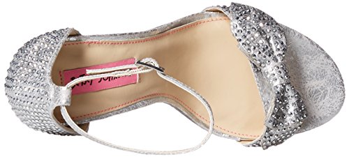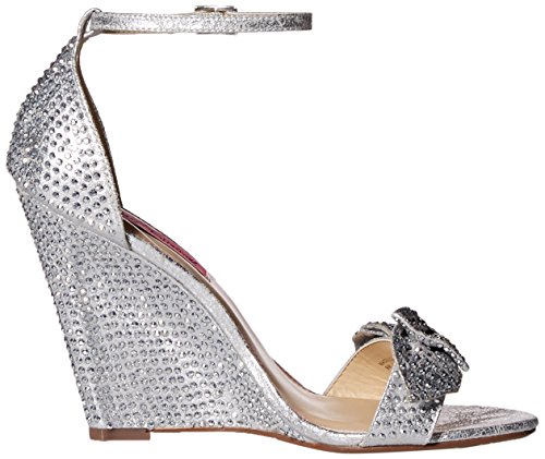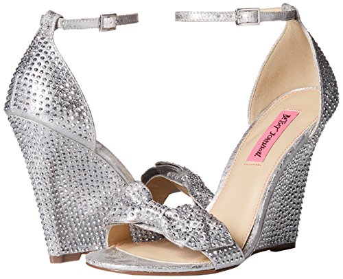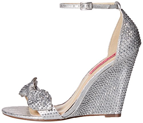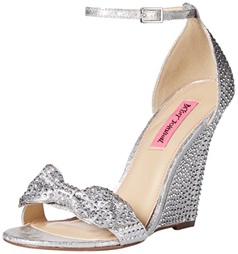 Two-piece dress sandal decorated with allover rhinestones featuring bow applique at toe strap Ankle strap with adjustable buckle closure Covered wedge Brand : Betsey Johnson Item model num : DELANCYY EAN : 0715924094072 Product Dimensions(LxWxH) :