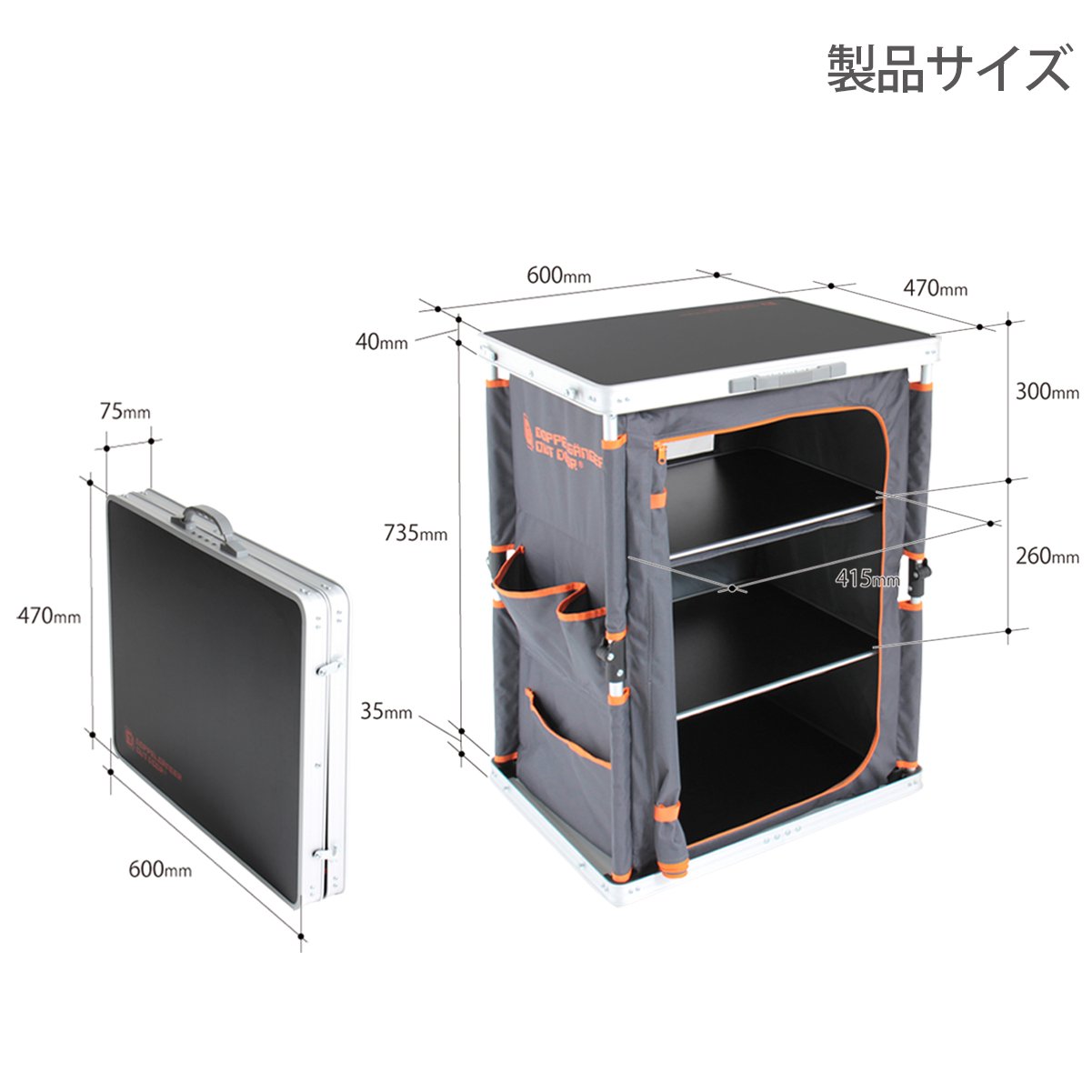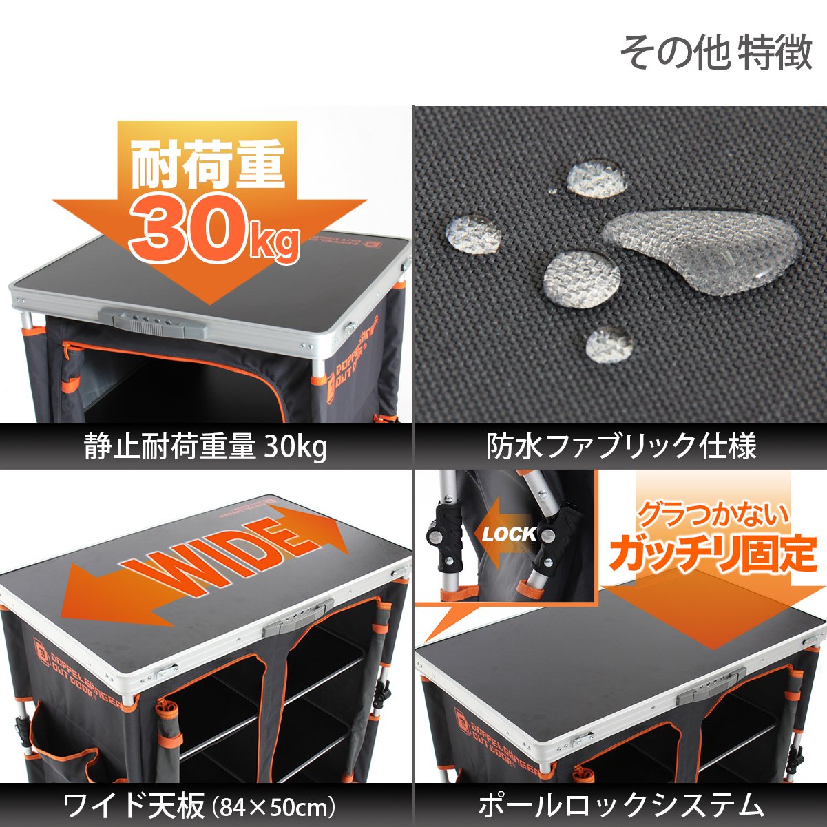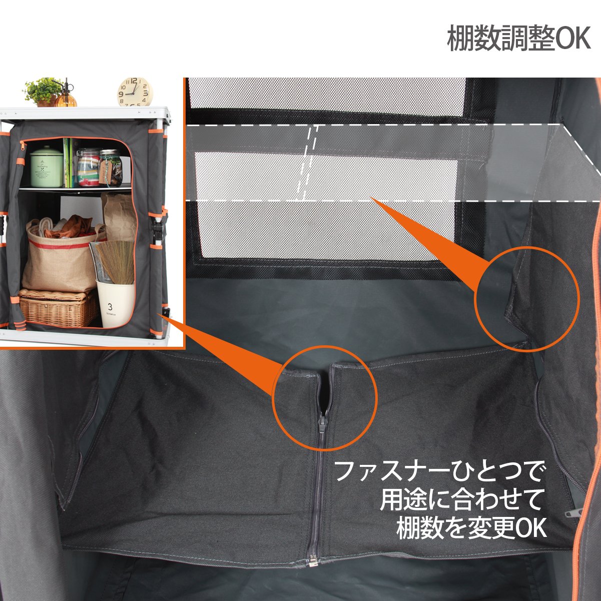 Foodstuffs, tableware, cooking utensils, etc. can be stored in shelves or side pockets in the table, so you can cook comfortably on the table.
