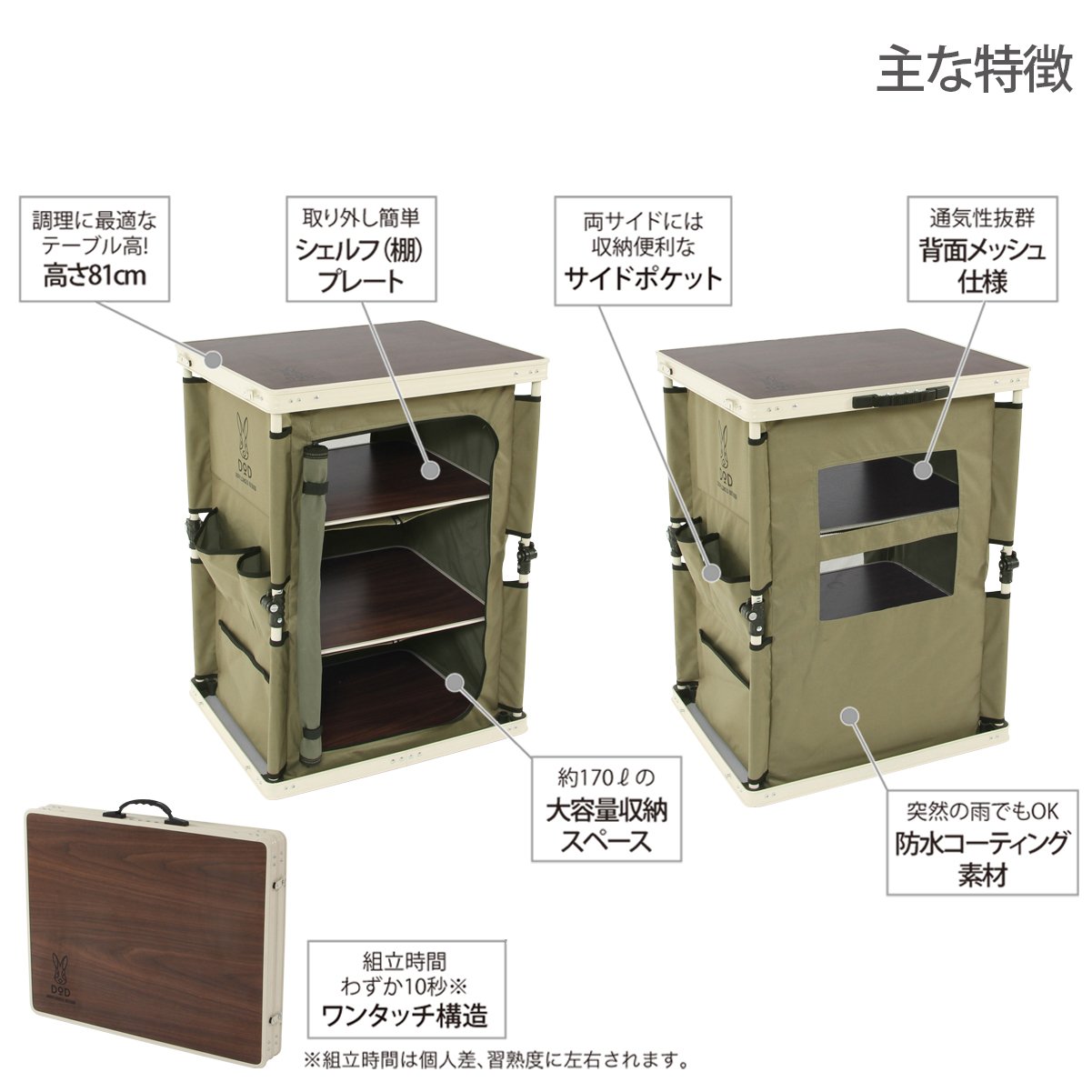 Also, it has many storage space, it is possible to organize and store camp gears and clothes that are likely to be cluttered, as a wardrobe inside and outside the tent.