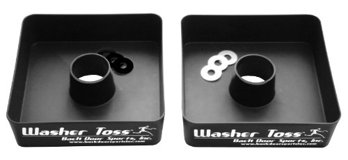 Washer Toss WG150 from Back Door Sports is designed to play 'Tub Style' the most popular way to play Washers! It is simple to learn and fun to play or watch. Great for those gathering of family and friends, the Washer Toss board features specially researched and engineered materials to maximize both game playability and durability. The polypropylene used in manufacturing all the Back Door Sports game boards is formulated to resist damage and drying from the sun and other natural elements. The washers are powder coated for durability. Washer Toss includes 2 game boards, 6 washers, complete instructions, and a carry bag.